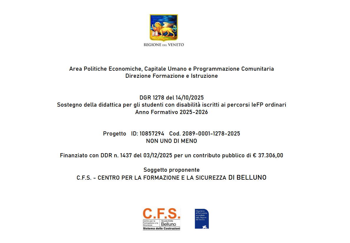 Il C.F.S. – Centro per la Formazione e la Sicurezza di Belluno, con sede a Sedico, è una scuola di formazione professionale rivolta ai ragazzi e alle ragazze che hanno concluso la scuola media e vogliono imparare un mestiere pratico, molto richiesto nel mondo del lavoro.